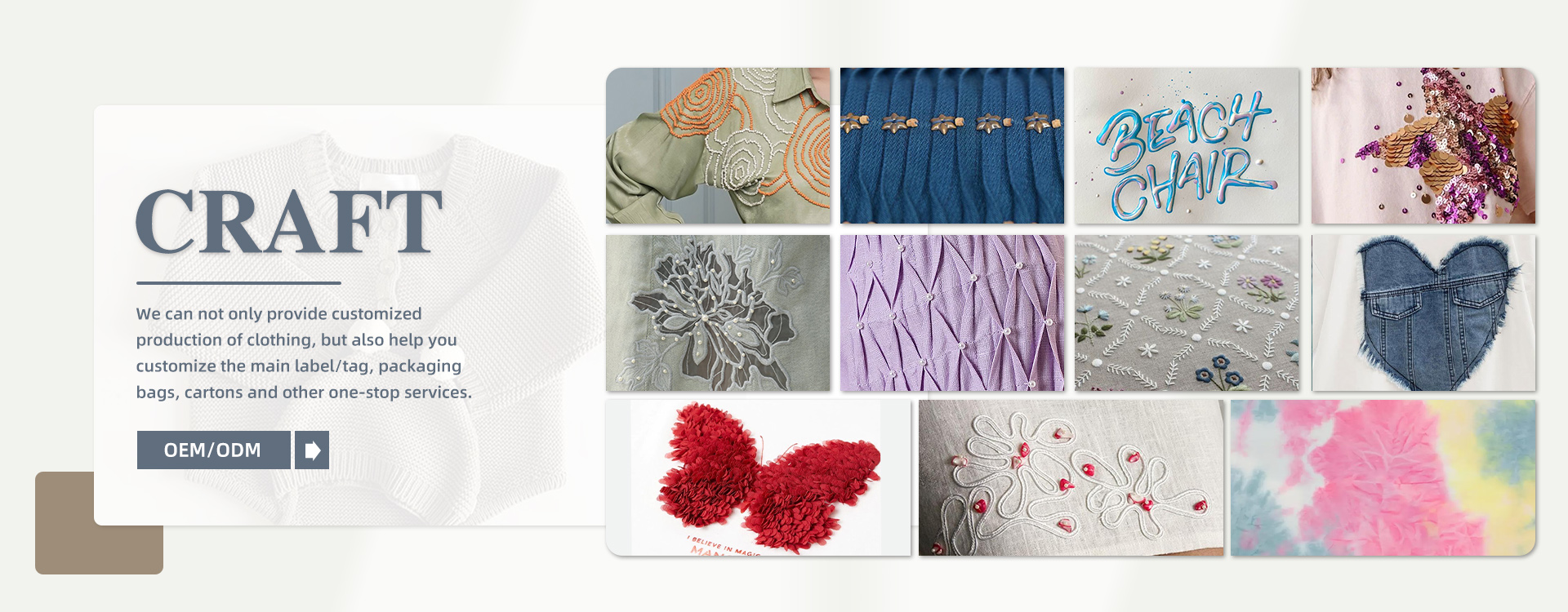 Our company will provide customers with a complete full set of customized services: before placing an order, we can provide free popular fabric cards of the season for customers to design new styles for reference, and can help to consult the transportation method and time so as to help customers calculate the order time. After placing an order, our company will provide a set of size charts for customers to confirm according to the sample we do for customer, and communicate more or less quantities as order before cutting. After shipment, help customers to track the goods in time to ensure customers will receive the bulk goods on time.