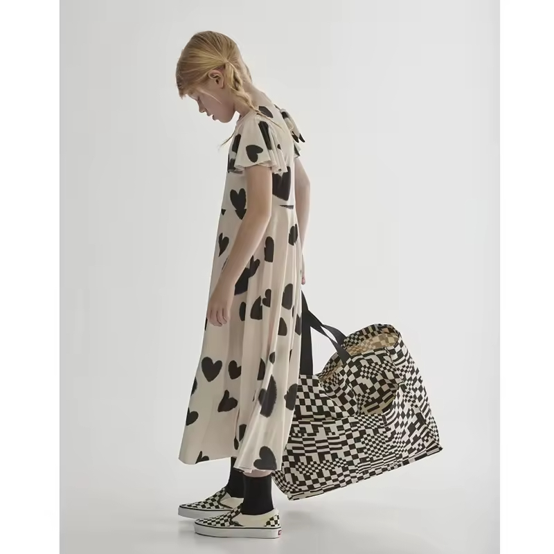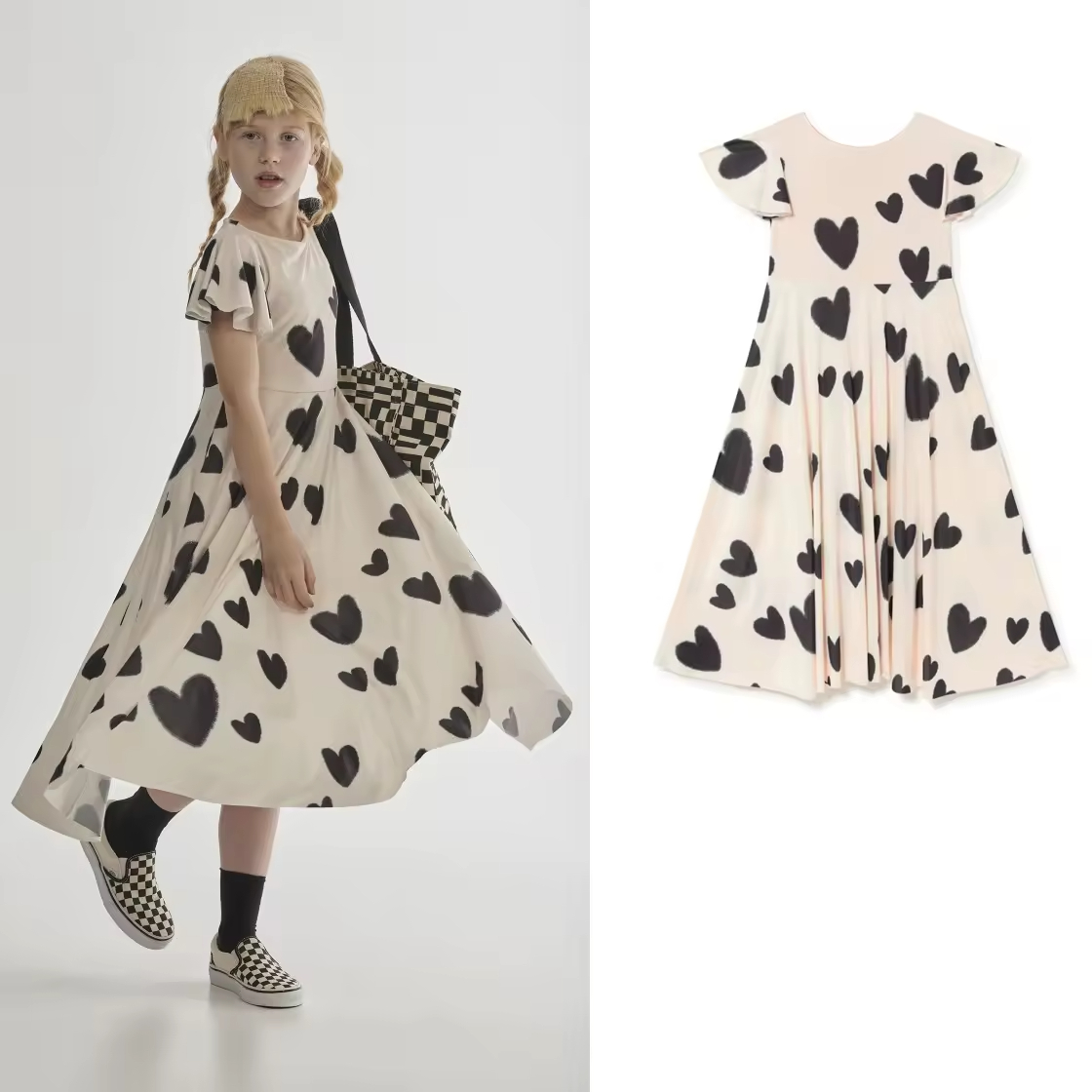 Heart Printed Girl's Long Dress Flared Short Sleeves Girls Twirl Dress