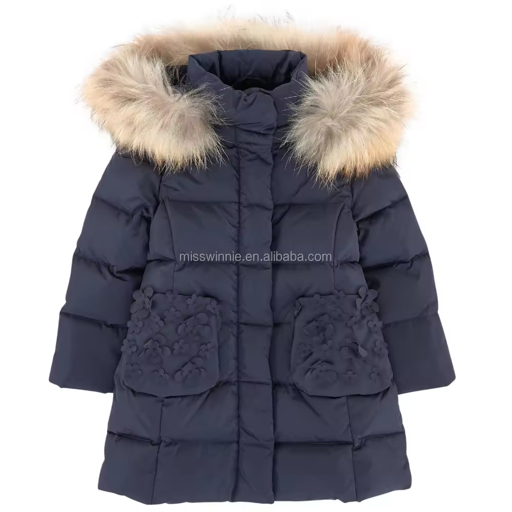 OEM New Design Children Girl Down Jackets With Hooded Pure Pattern With Flower Applique Pocket Casual Style Down Coat