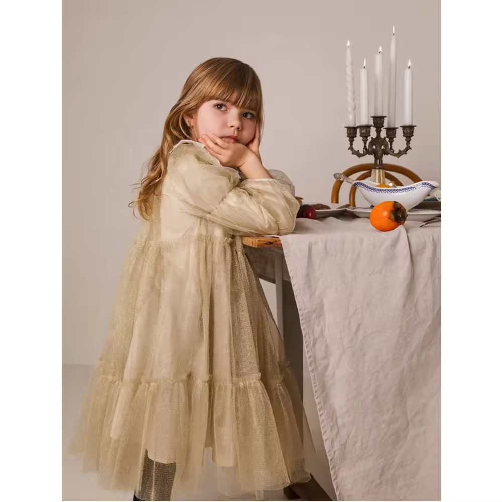 /Custom Spring Gold Lace Long Sleeve Tulle Boutique Girls Birthday Party Dresses Toddler Kids Clothing Children Outfit 2-12 Y