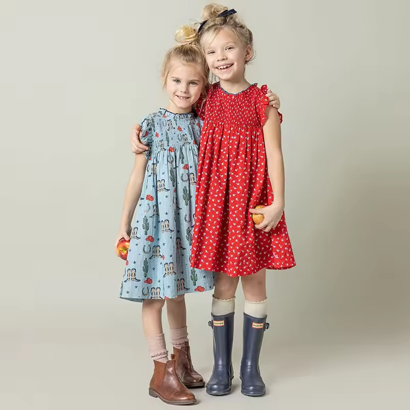 2024 Beby Red Princess Dress for Children Casual Summer Mini Dress With Short Sleeves Cotton Fabric and Bow Decoration