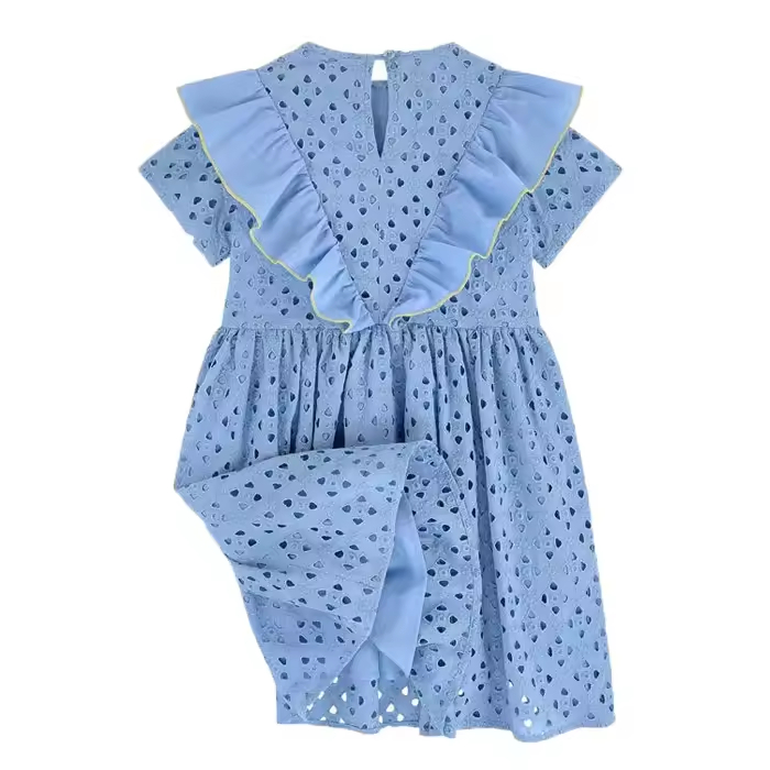 /OEM&ODM New Arrival Fashion Design Jacquard Fabric Cotton Light Blue Ruffles Girl Dress Kid Frock for Girls