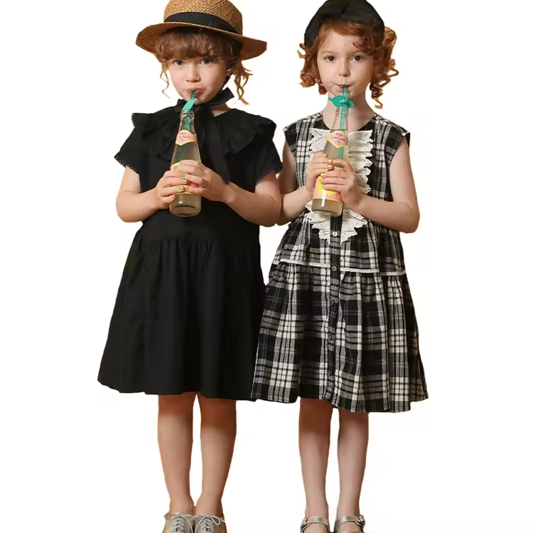 Best Selling High End Design Kid Summer Clothes Girls Dress 2025 Custom Elegant Black Color and Plaid Ruffles Baby Girl Dresses
