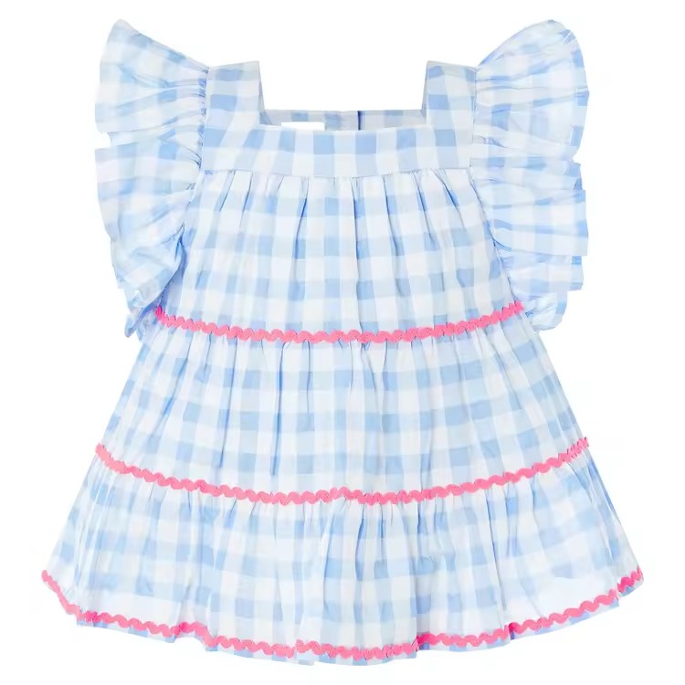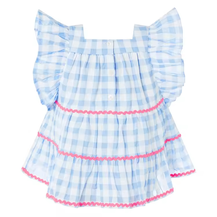 /Fashion High Quality Children Frocks Designs Blue Grid Girls Fancy Dresses Beautiful Cute Flounce Sleeves Baby Summer Dress