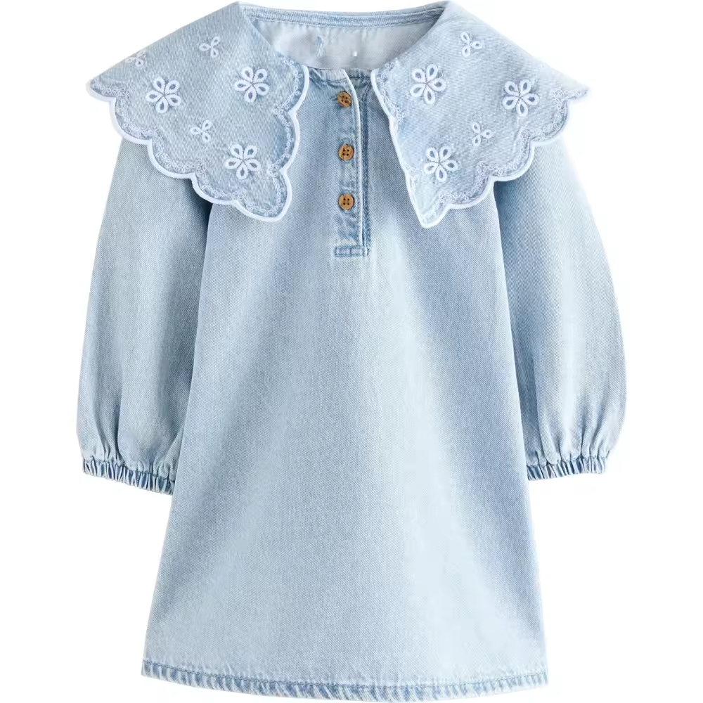 OEM and ODM Customized Kids Embroidered Peter Pan Collar Denim Dress Long Puff Sleeves for Girls Summer Outfit