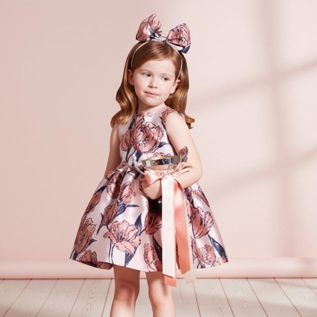 Guangzhou custom polyester jacquard Little Princess Autumn Bow Print A-Line Mini Girls Dress Factory
